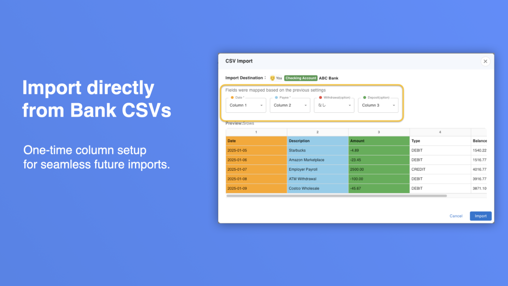 Easily import statement files (CSV format) from banks, credit cards, and brokerage firms via simple drag-and-drop.