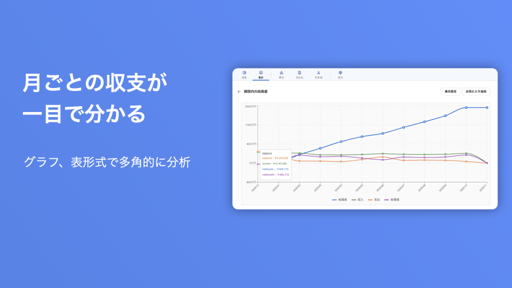 複数の口座を統合し、資産の合計額と純資産の推移を一目で確認できます。毎月の収支や支出の傾向を、グラフ、表形式で多角的に分析。