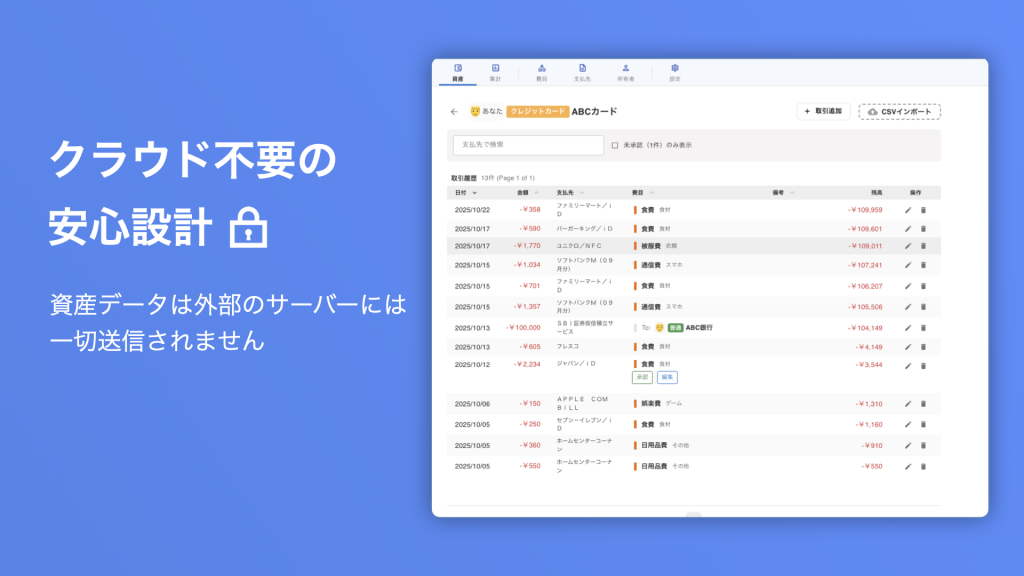 あなたの資産データは、外部のクラウドサーバーには一切送信されません。